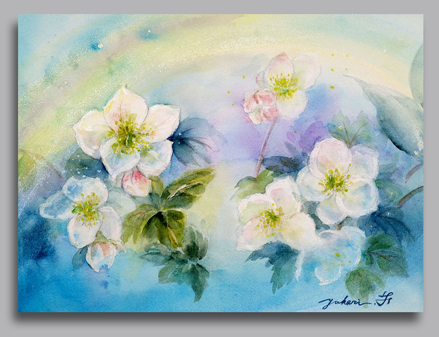 花に想いをのせて大切な人へ 厳しい寒さの中 逞しく次々と咲きはじめるクリスマスローズ 私達も 大地と繋がり 地球に抱かれて 大自然の恩恵に生かされている そして たくさん存在から見守られています 水彩えのぐ、アクリル 写真.撮影 松 永 康 弘氏 額入り写真 写真で ご購入いただけます メールお問い合わせ